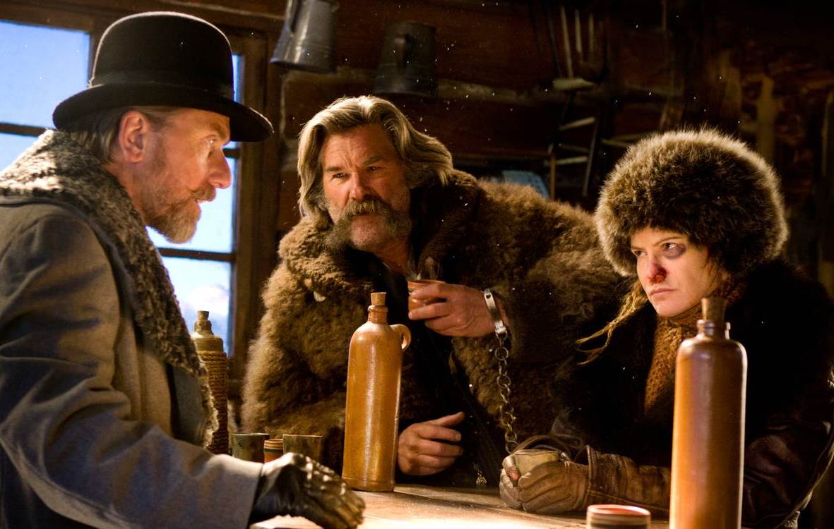 But back to that blizzard-beset stagecoach for a moment. Its two occupants are John Ruth (Kurt Russell, sporting the grandest mustache of them all) and Daisy Domergue (Jennifer Jason Leigh, having a blast), and while they occasionally laugh and bicker like an old married couple, their relationship is far from harmonious—a point made hideously clear when John, displeased with one of Daisy’s japes, sharply elbows her in the face. Daisy, we learn, is a murderess, and John is an infamous bounty hunter nicknamed “The Hangman”; he is transporting his captive to the village of Red Rock for execution. On the snowy road, they collect another bounty hunter, Major Marquis Warren (Samuel L. Jackson, giving his most committed performance in years), along with Chris Mannix, a southerner who proclaims himself to be Red Rock’s sheriff but who is instantly untrustworthy by virtue of being played by Justified‘s Walton Goggins. Eventually, the snowstorm requires them to hole up at a shop-cum-saloon dubbed Minnie’s Haberdashery. There, they encounter a curious group of colorful characters: Oswaldo Mobray, an eloquent hangman (Tim Roth); Joe Gage, a laconic cowpuncher (Michael Madsen); Sandy Smithers, a former general in the Confederacy (Bruce Dern); and Bob, the ranch hand who runs the place in Minnie’s absence (Demian Bichir). Given the movie’s title, you presumably need not tick off each of these names on your fingers to arrive at their sum total. (Technically, I count nine, but apparently no one cares about the stagecoach driver, played by Tarantino regular James Parks.)