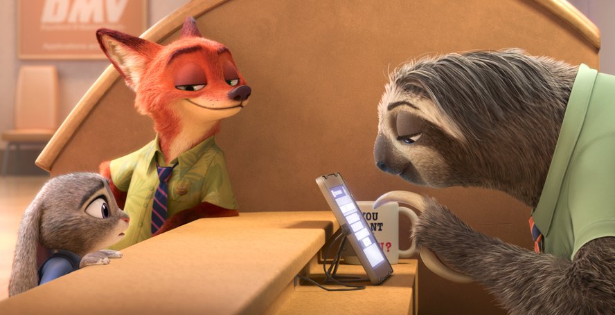 Get lost, right? Not so fast. Even for curmudgeons of a certain age, Zootopia quickly proves fleet and appealing, and not just for its eye-popping animation. It also reveals itself to be narratively ambitious—in addition to serving as a coming-of-age/fish-out-of-water story, it’s an involving caper. First given the humiliating assignment of parking duty, Judy learns about the ongoing investigation of a lost otter, and she resolves to crack the case. In the process, she runs into Nick Wilde (Jason Bateman), a sly fox with a sharp tongue and a slick hustle. Nick is everything Judy isn’t: experienced, selfish, and woefully cynical. He is, in other words, her perfect partner, and Judy—thanks to her quick wit and her knowledge of tax law—soon enlists his help in recovering the missing mammal.