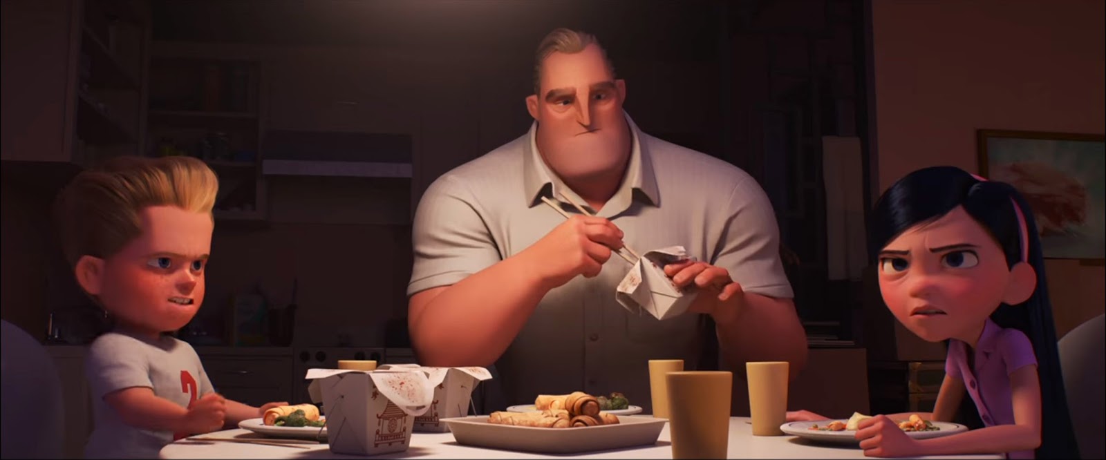 And of course, there is a seemingly prosaic scene of the Parr family eating dinner together, a medley of sniping, taunting, and grumbling that remains the franchise’s most durable source of comedy. Yet this shared meal also ties in thematically with the Screenslaver, a villain who’s more threatening intellectually than viscerally. From a plotting perspective, the Screenslaver isn’t all that interesting; his secret identity isn’t particularly hard to guess, and his long-simmering vendetta against superheroes isn’t too different from that of Syndrome, the big bad from the first film. But in the era of social media and Black Mirror, there is something genuinely disturbing about the Screenslaver, an anonymous malevolent force that can invade your privacy and bend you to its will. If nothing else, parents who lecture their children about the perils of excessive screen time can leave the theater armed with a dastardly bogeyman.